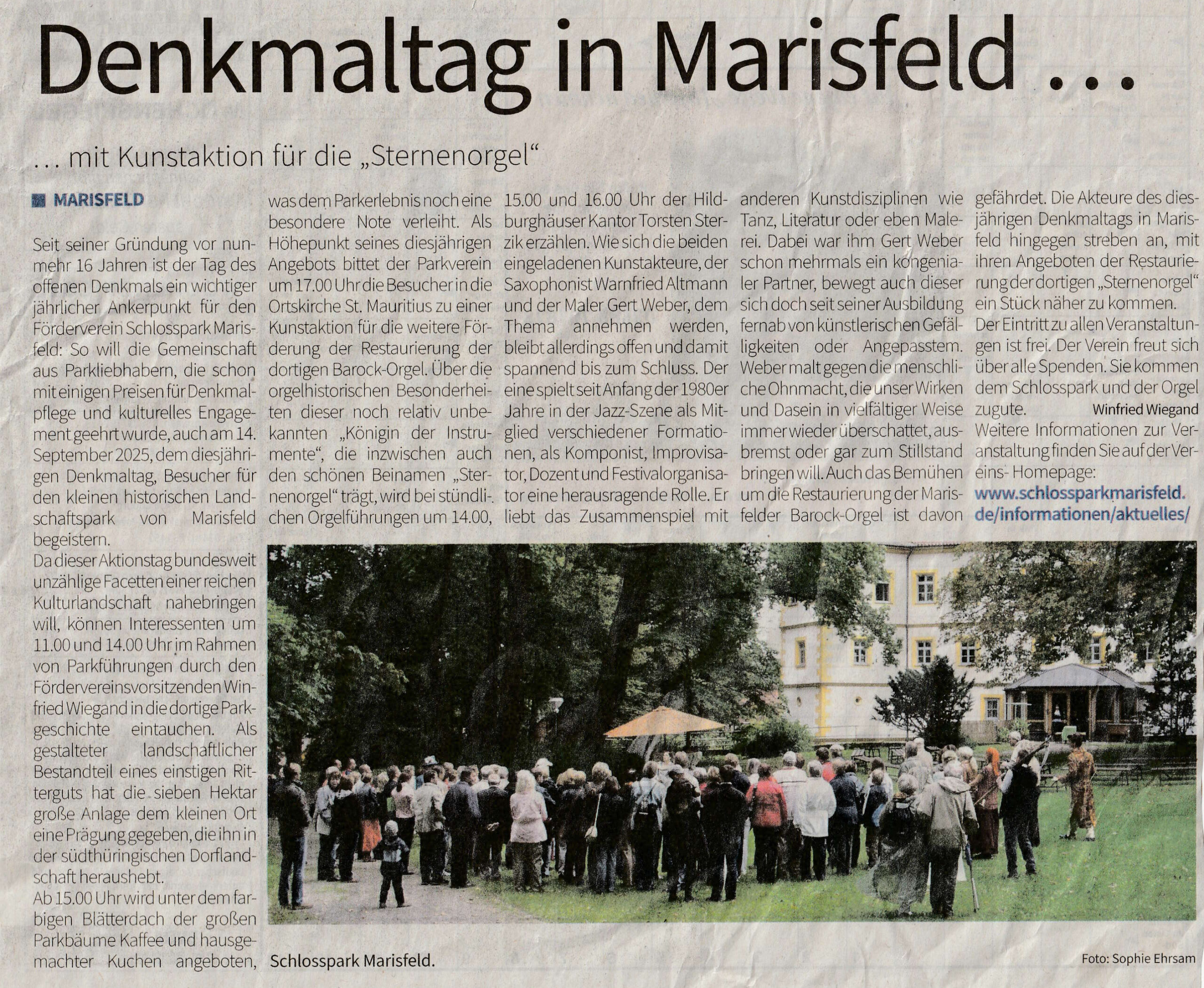 Seit seiner Gründung, vor nunmehr 16 Jahren, ist der Tag des offenen Denkmals ein wichtiger jährlicher Ankerpunkt für den Förderverein Schlosspark Marisfeld: So will die Gemeinschaft aus Parkliebhabern, die schon mit einigen Preisen für Denkmalpflege und kulturelles Engagement geehrt wurde, auch am 14. September 2025, dem diesjährigen Denkmaltag, Besucher für den kleinen historischen Landschaftspark von Marisfeld begeistern.