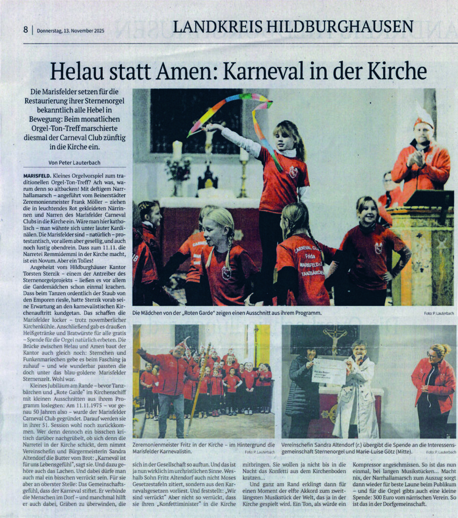 Deshalb ist es wichtig, dass wir unsere wertvollen Orgelschätze bewahren. Das Projekt „Marisfelder Sternenorgel“ ist ein herausragendes Bespiel bürgerschaftlichen Engagements zum Erhalt unserer Orgeln. Ich danke allen, die zum Gelingen dieses Projektes beitragen, allen voran der Interessengemeinschaft „Marisfelder Sternenorgel“ und dem Evangelischen Kirchengemeindeverband Marisfeld.